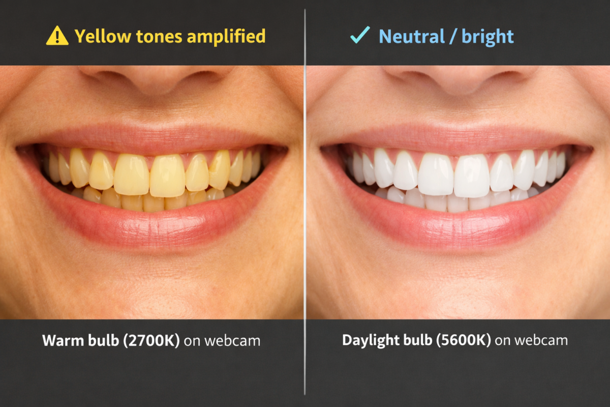 A modern HD or 4K webcam doesn’t adapt the way your eye does. It captures and amplifies warm tones, particularly yellows, so what looks neutral in your bathroom mirror renders as notably yellow or grey on screen. This is a lighting physics problem, not a dental hygiene failure.